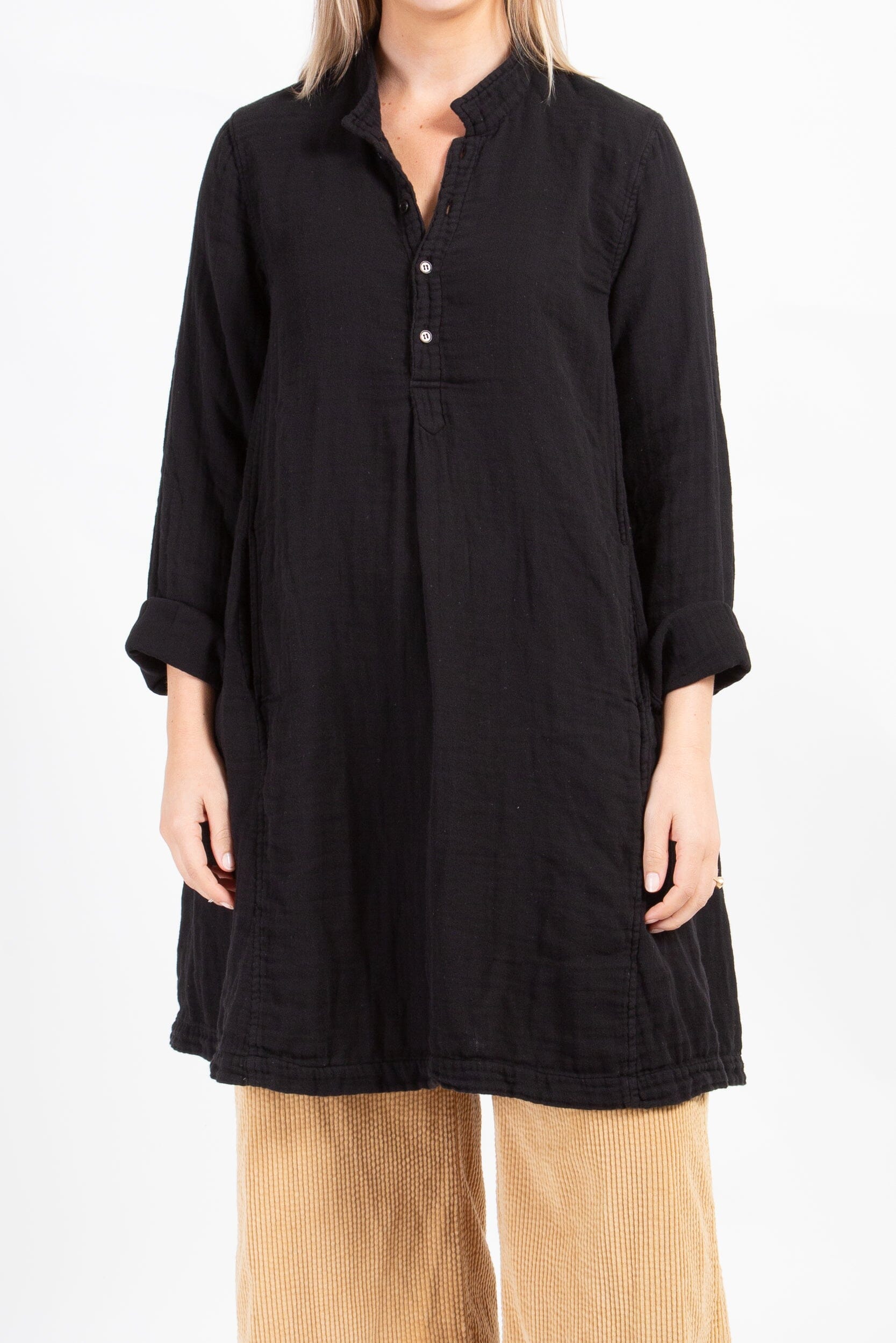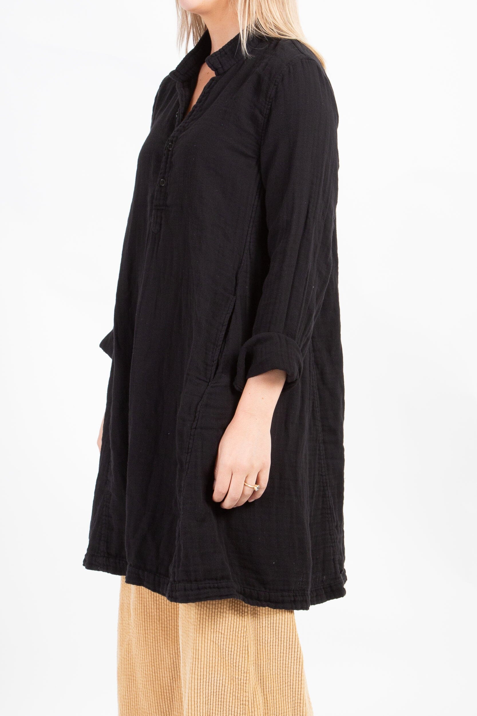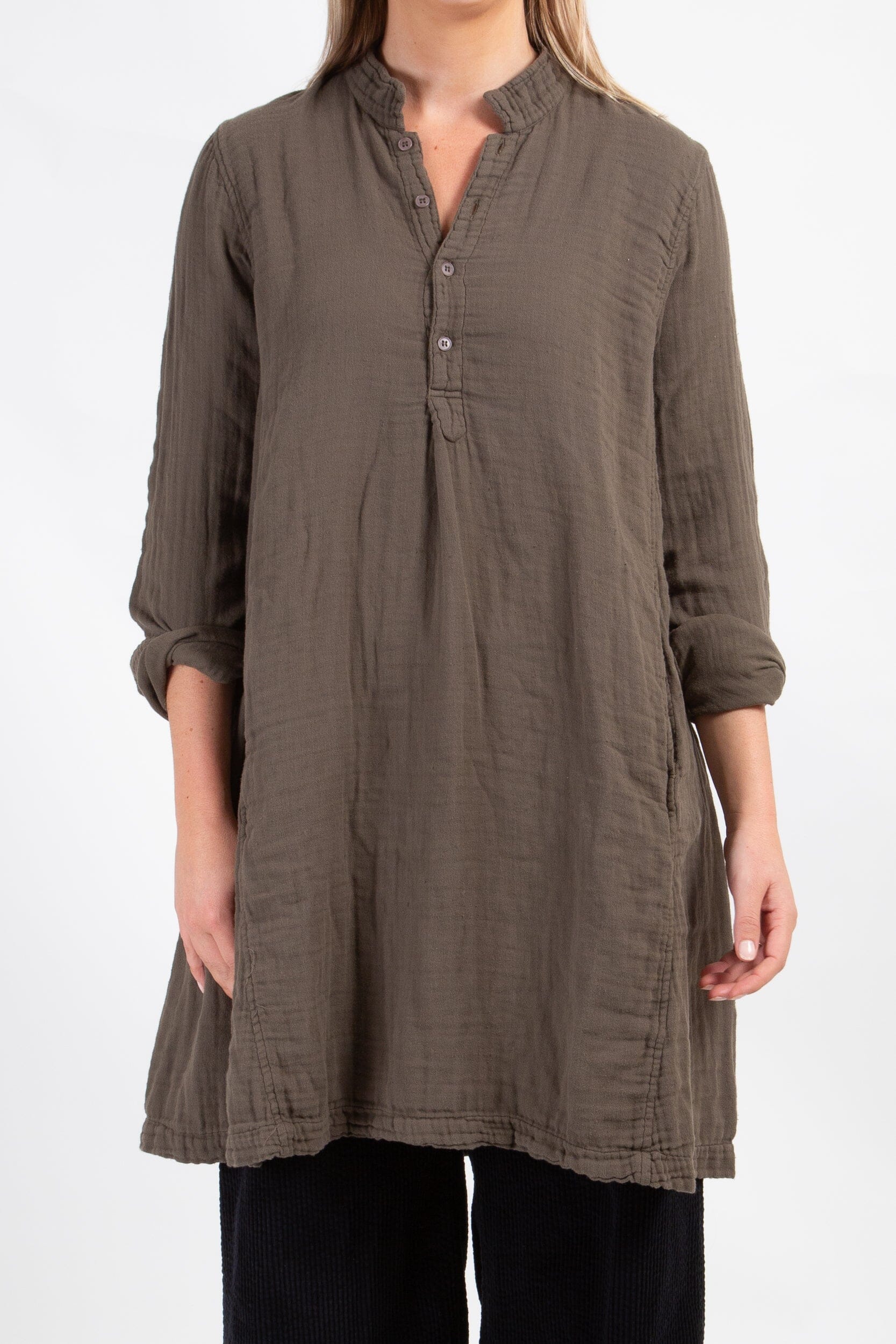 Long sleeve tunic with inset pockets and a short collar. Godet panels at side seams.