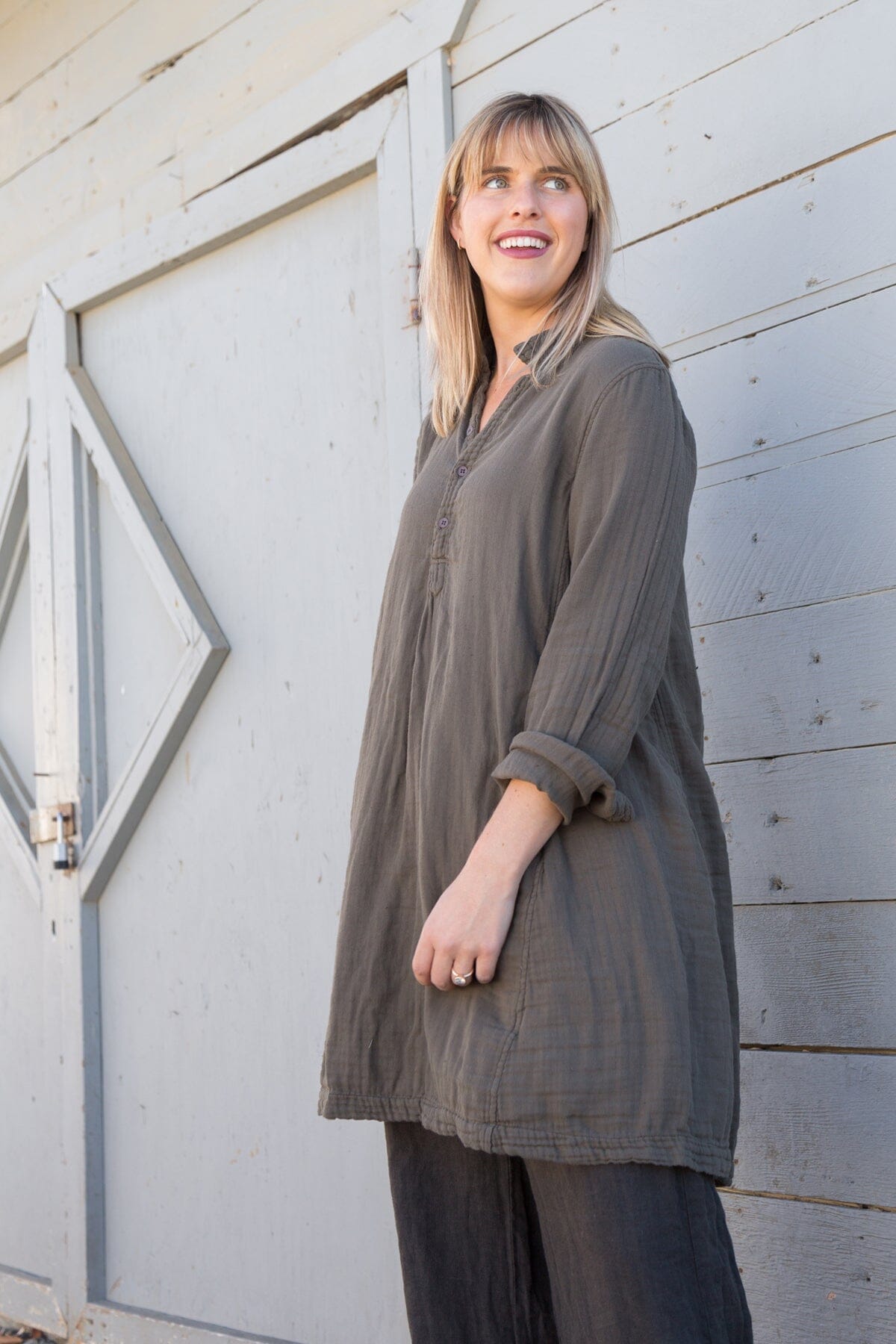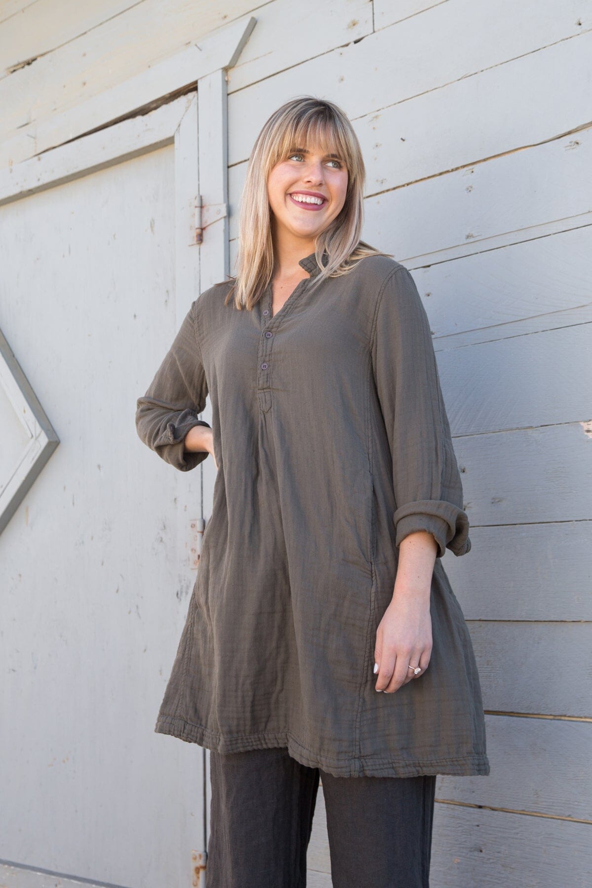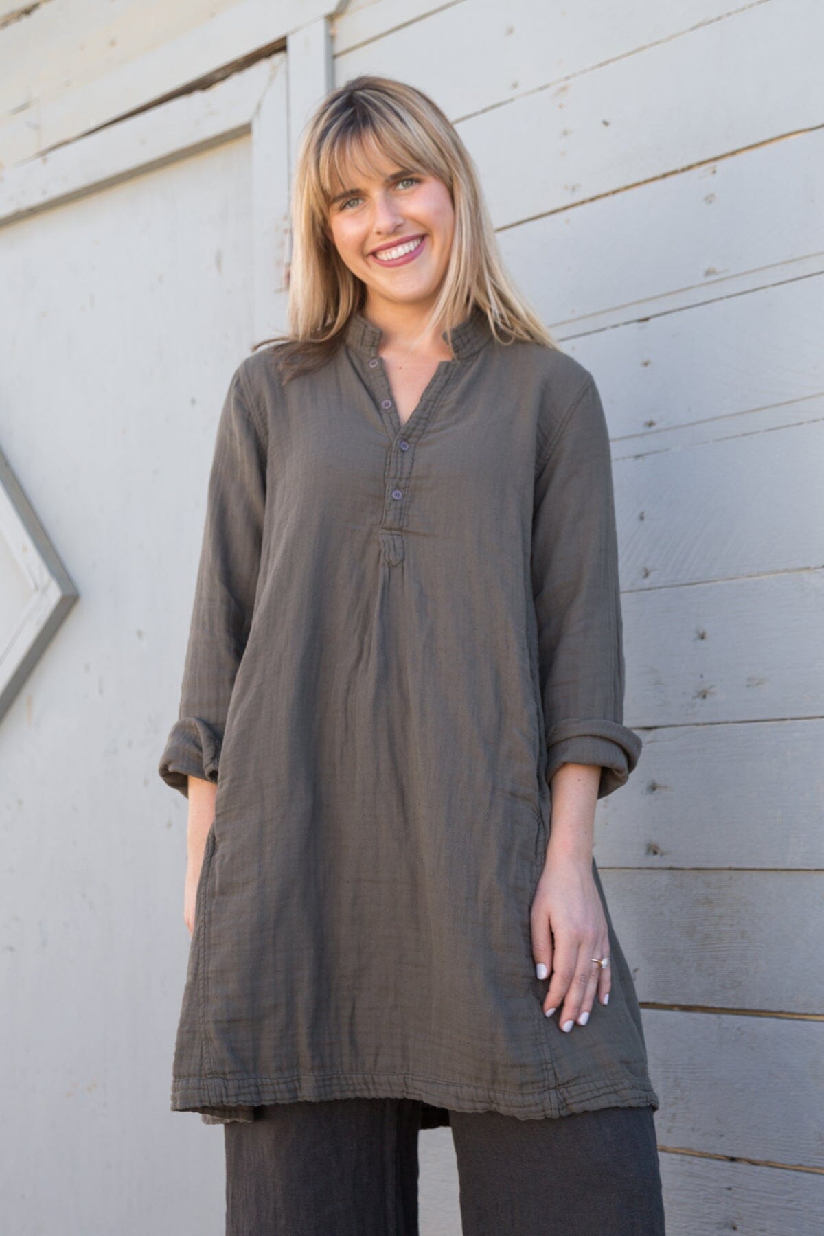 Long sleeve tunic with inset pockets and a short collar. Godet panels at side seams.