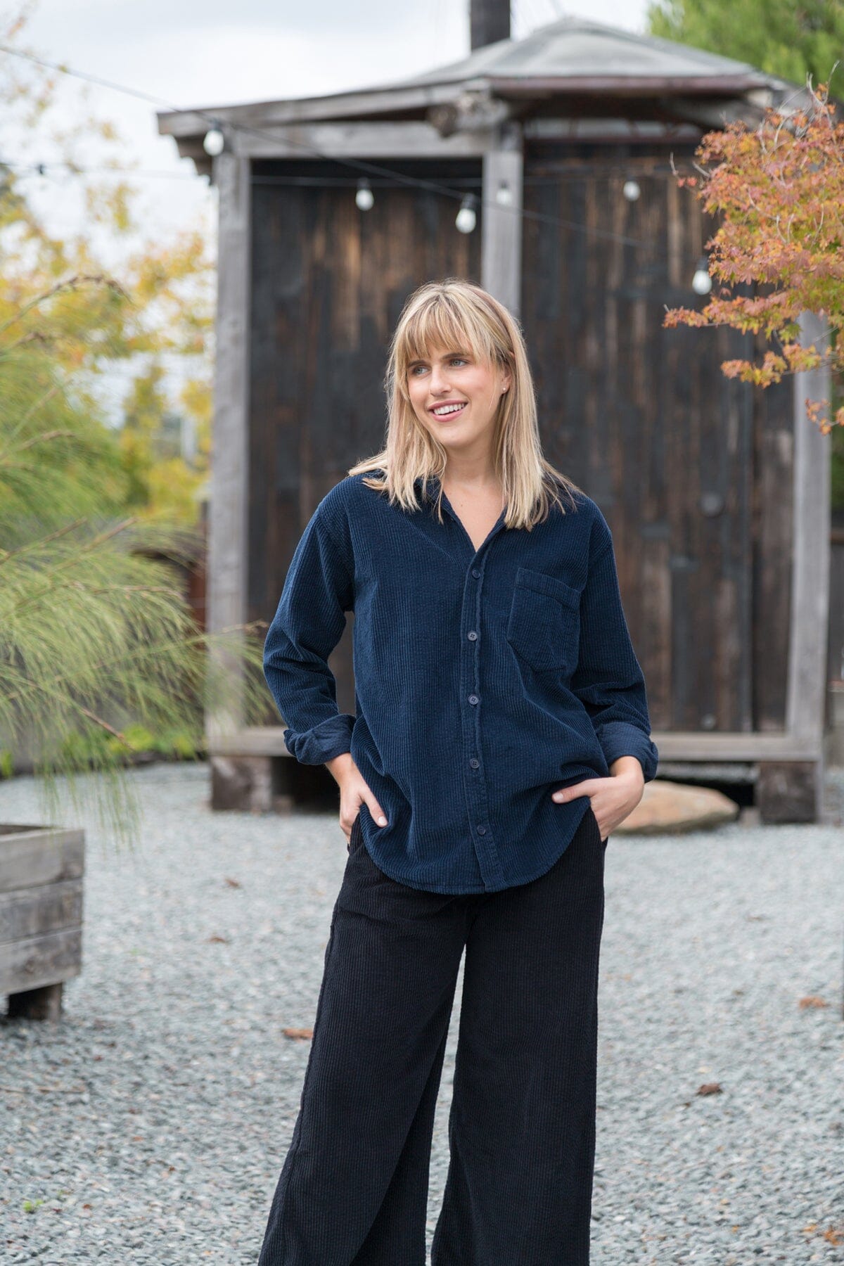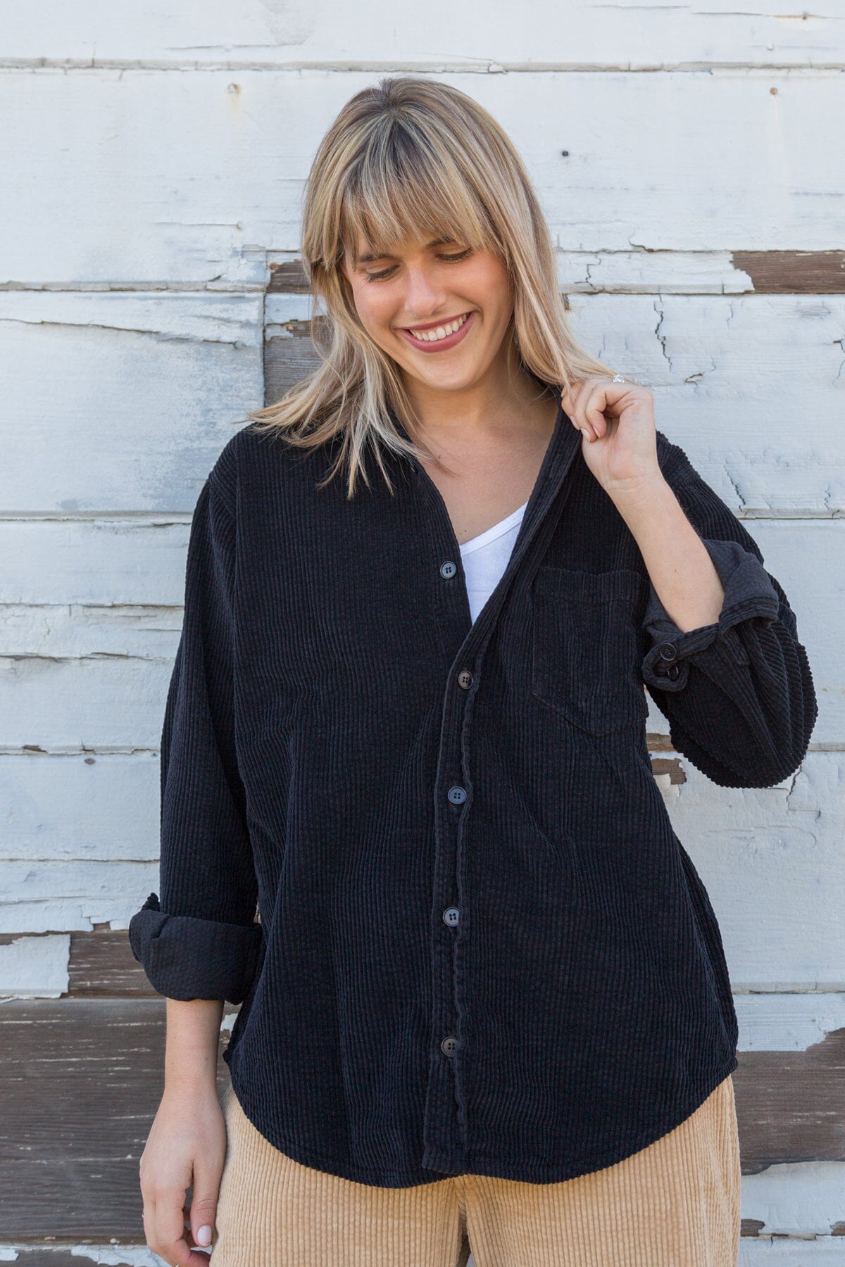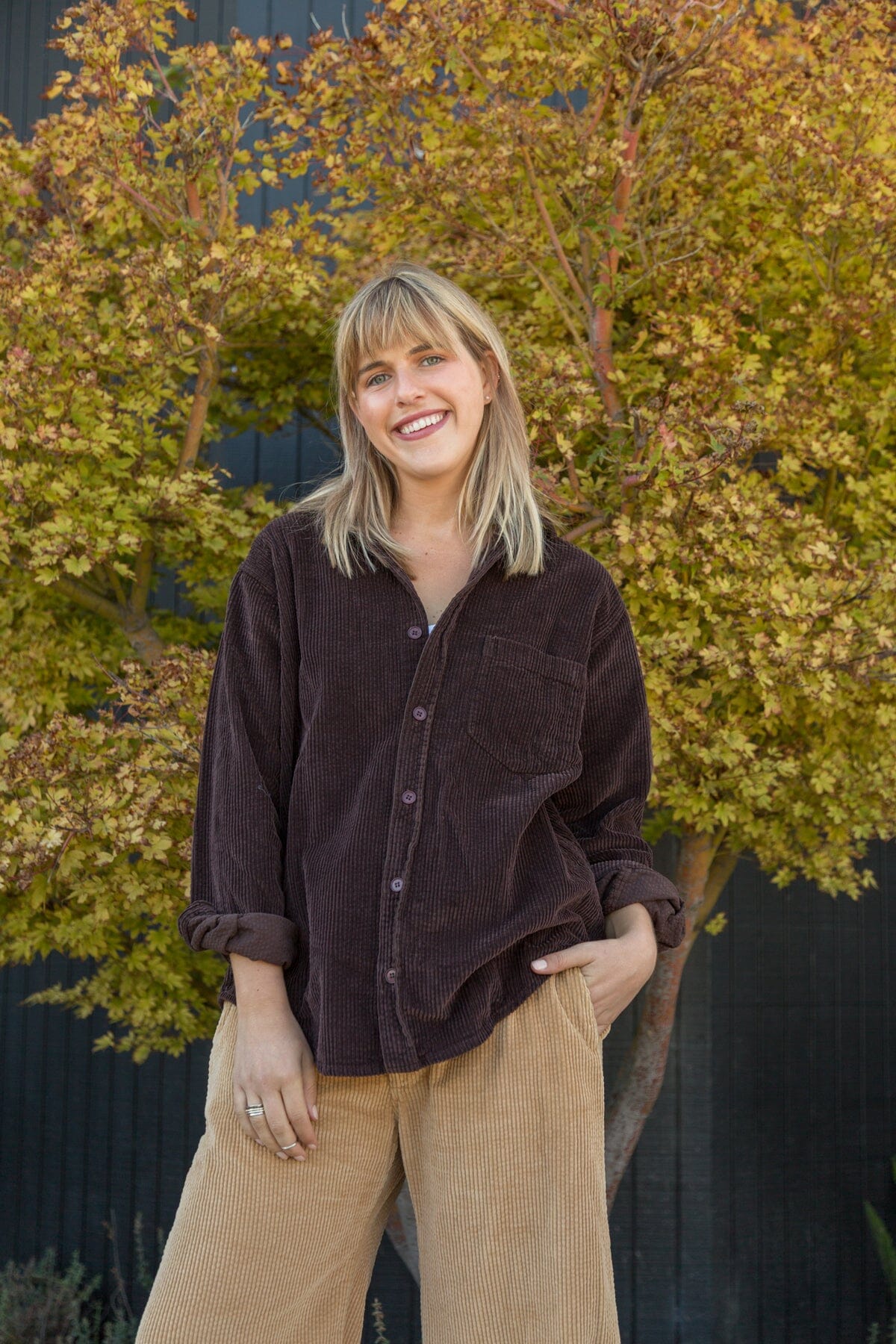 Button up collared shirt with a bust patch pocket and a box pleat on the back.