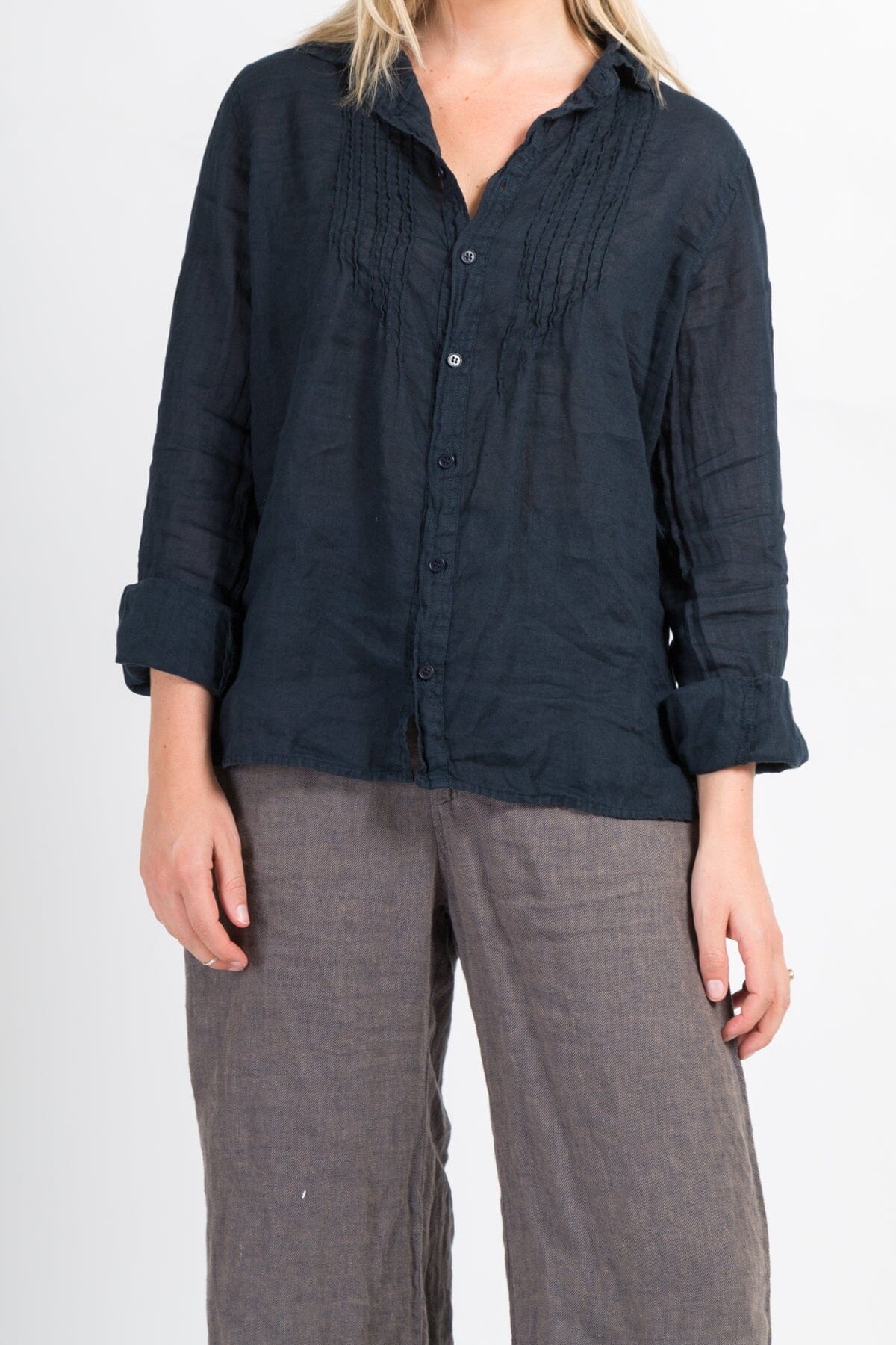 Long sleeved button up shirt with pin tucks
