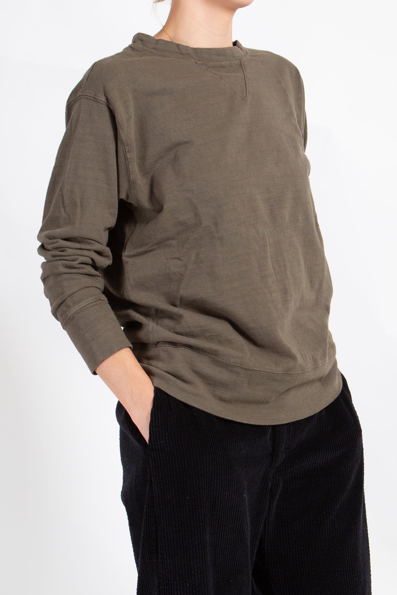 V-stitch collar sweatshirt with double seaming at the waist and cuffs.