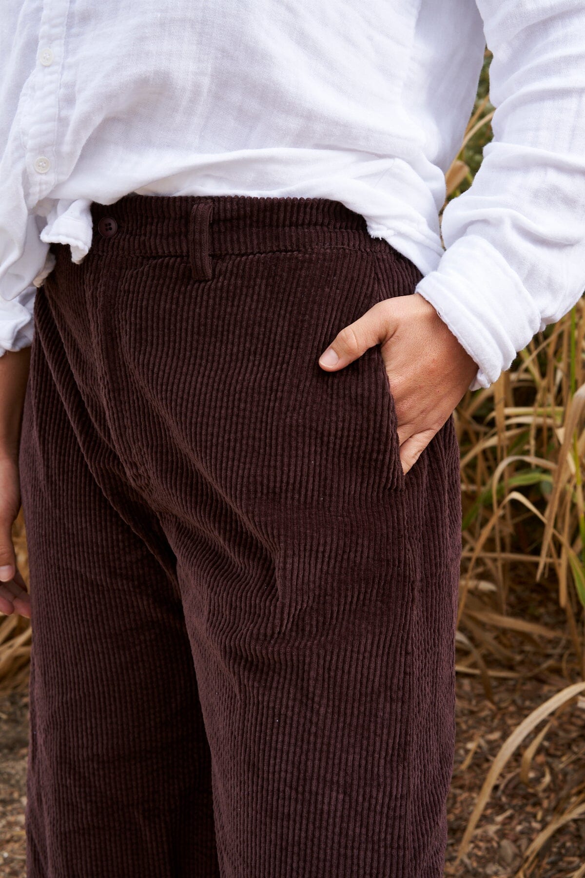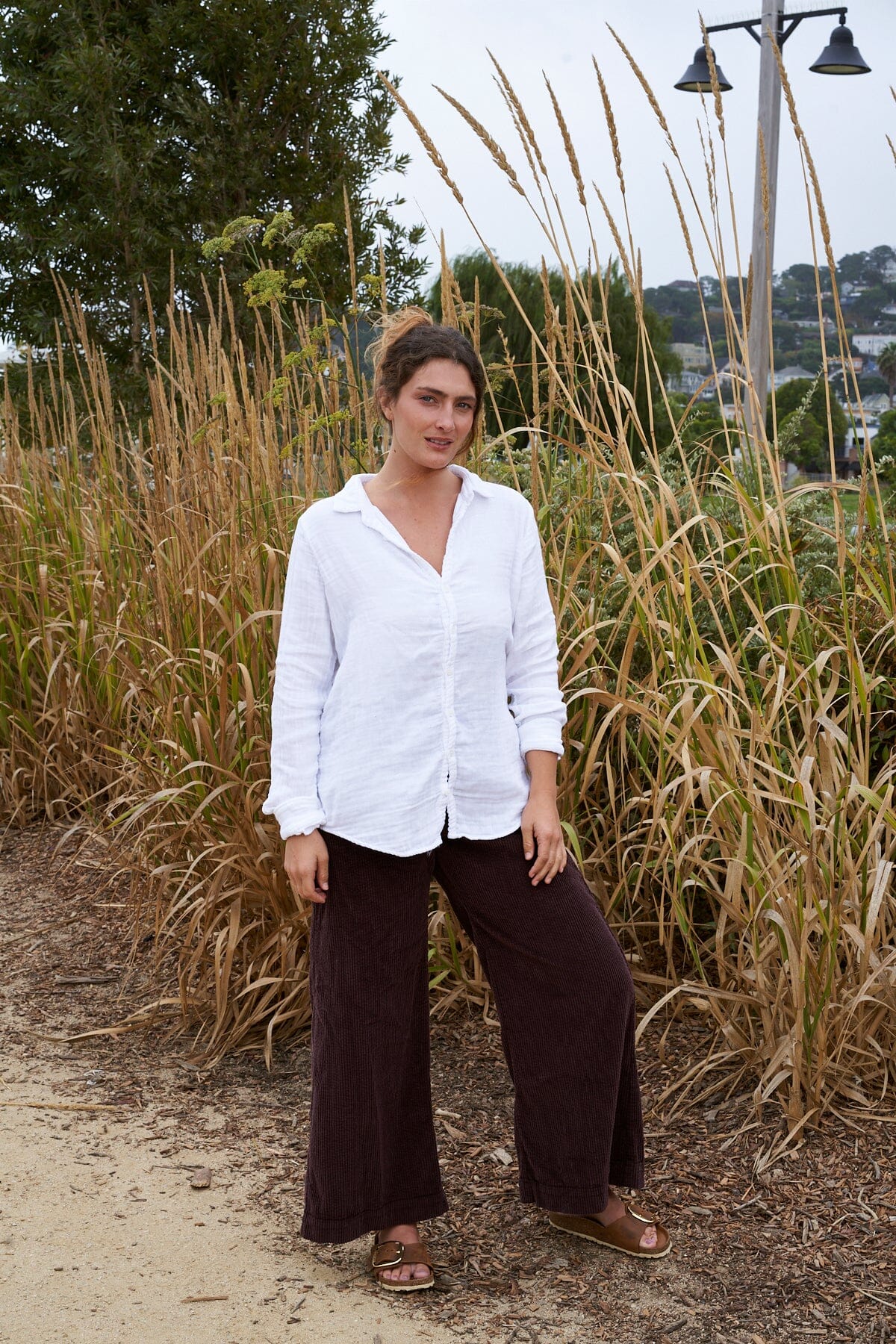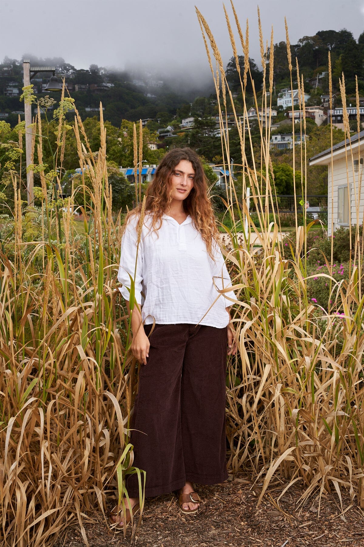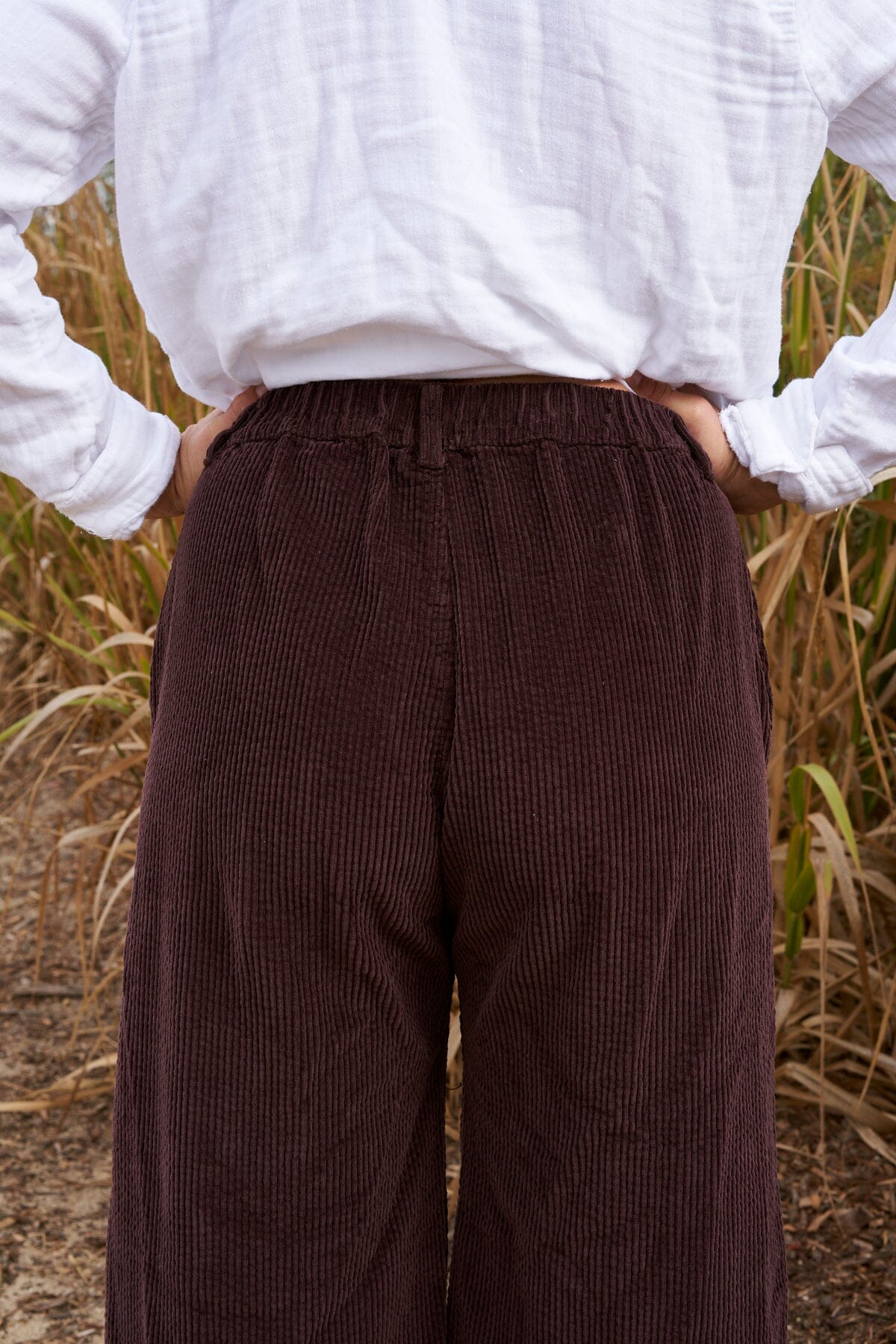 Polly is a wide-leg pant featuring a zipper, pockets, and elastic across the back waist.