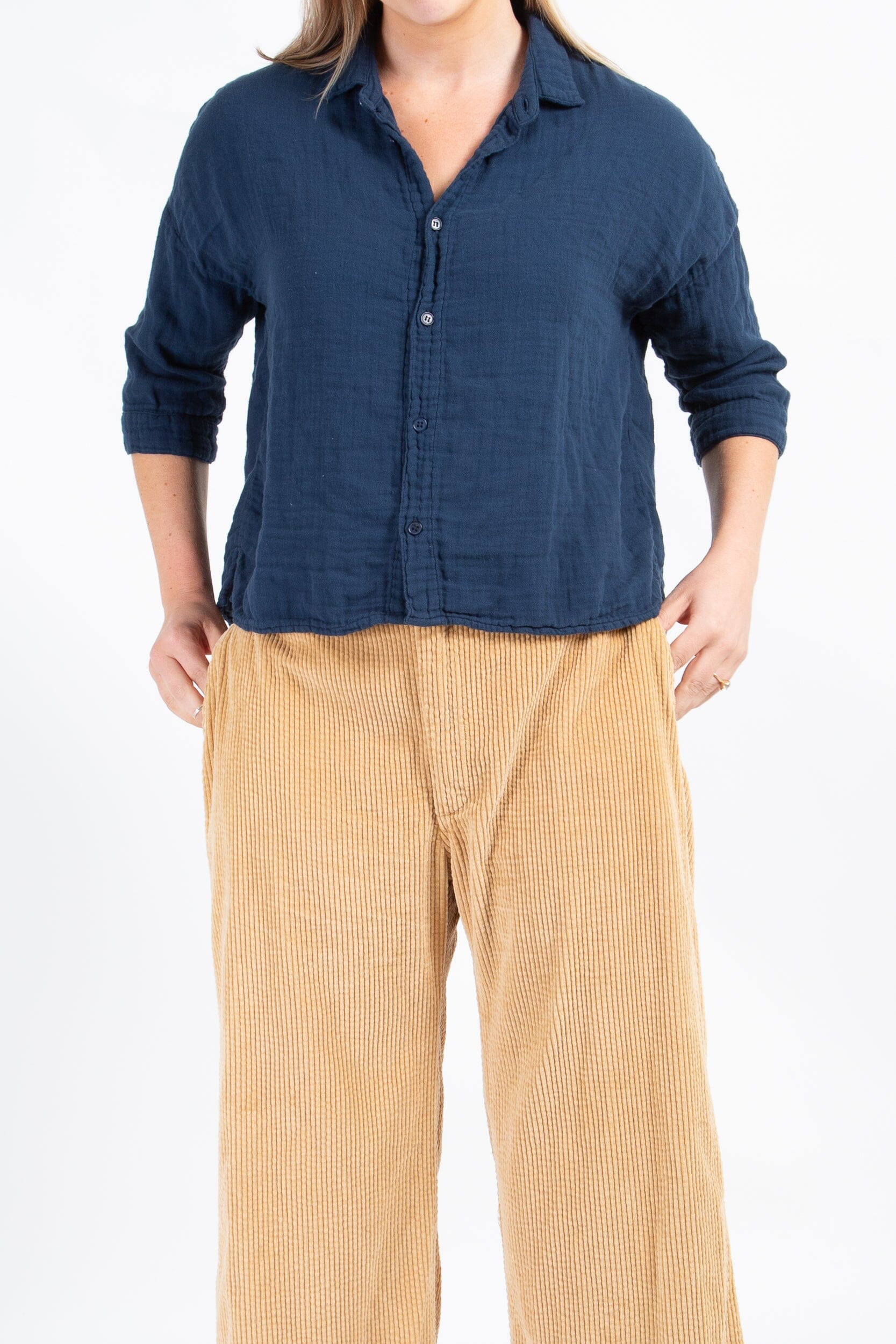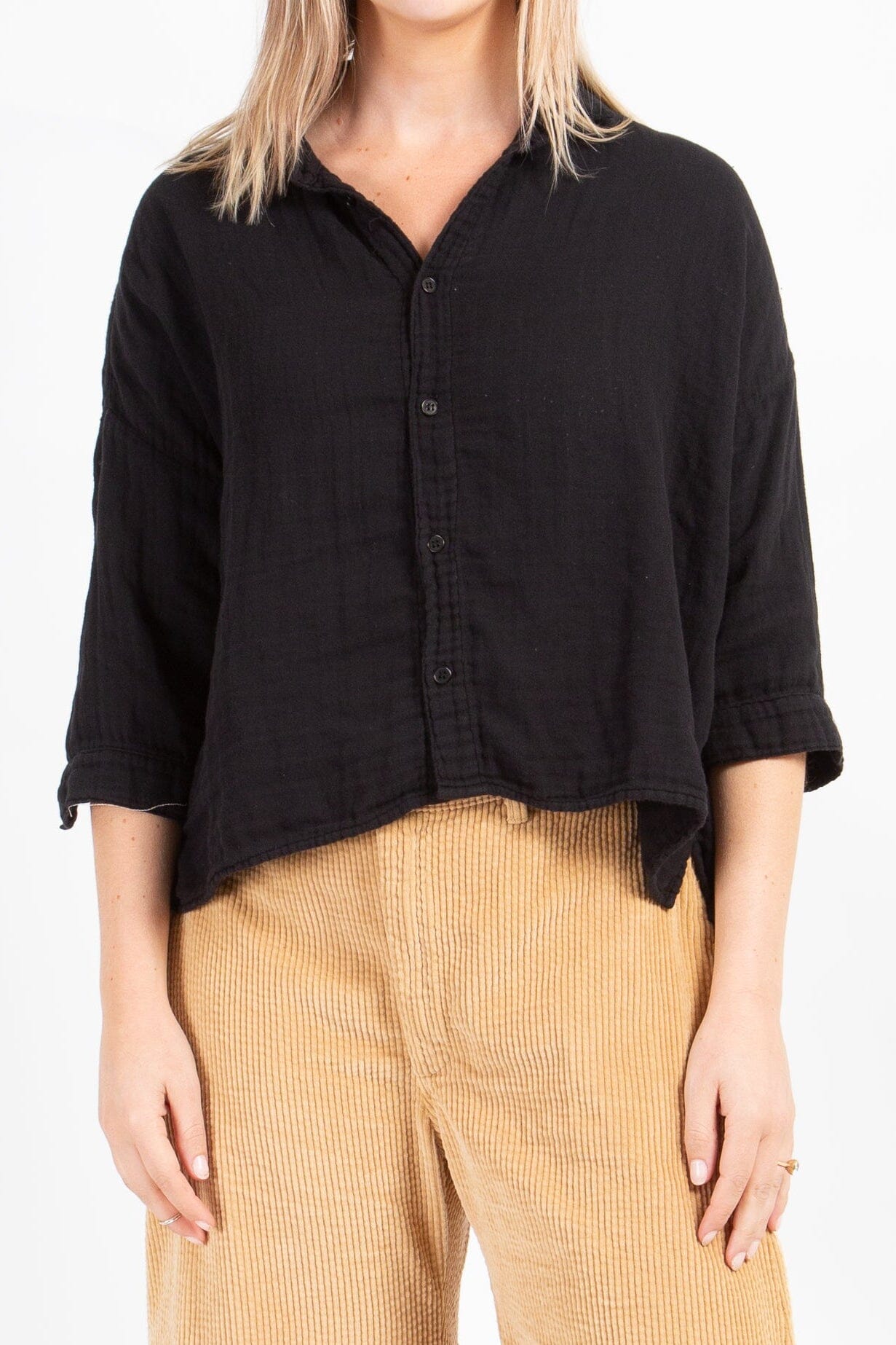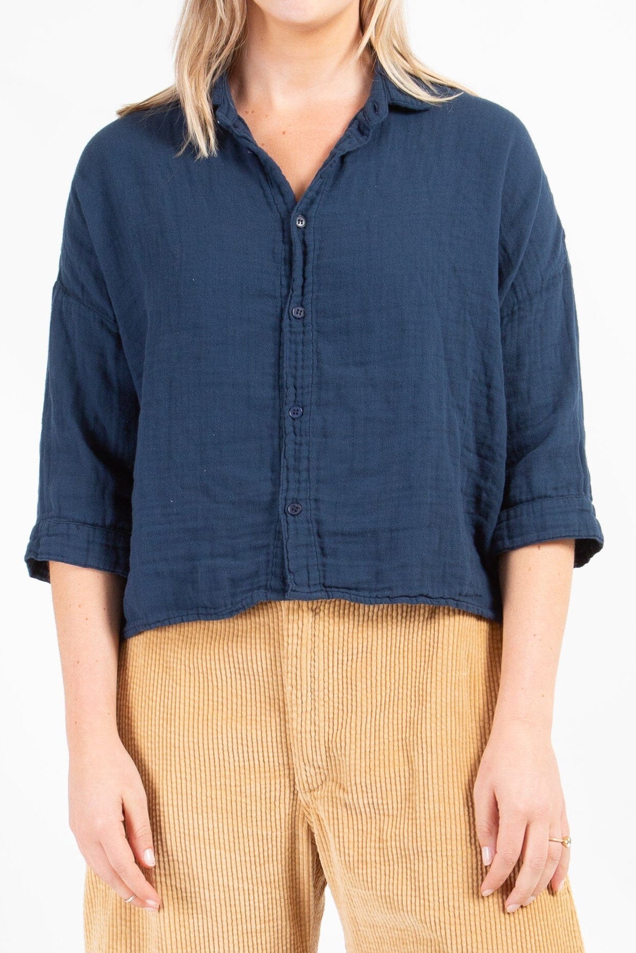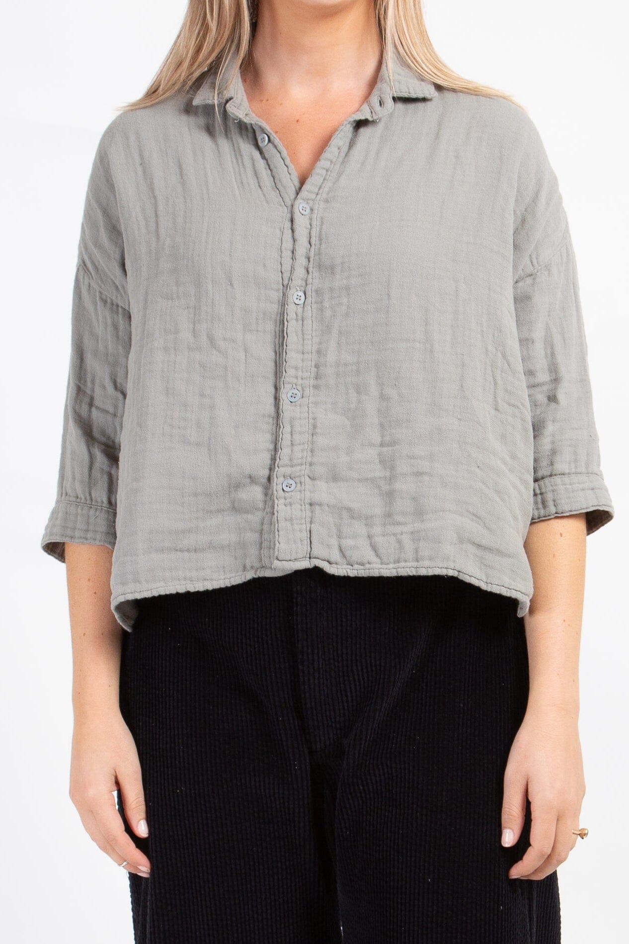 Boxy cropped shirt with a long sleeve and dropped shoulder.