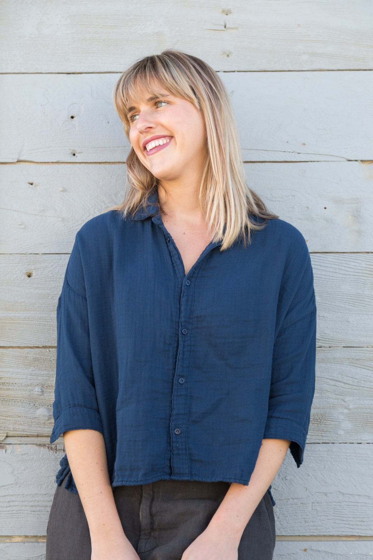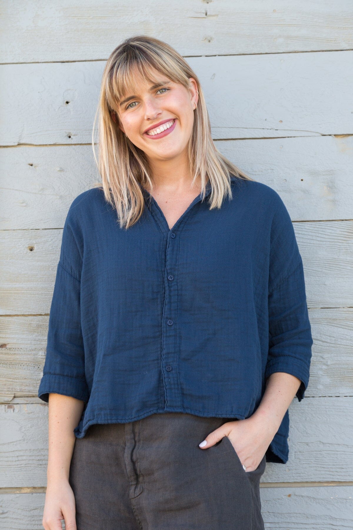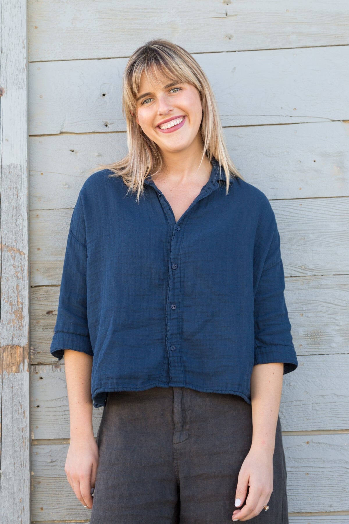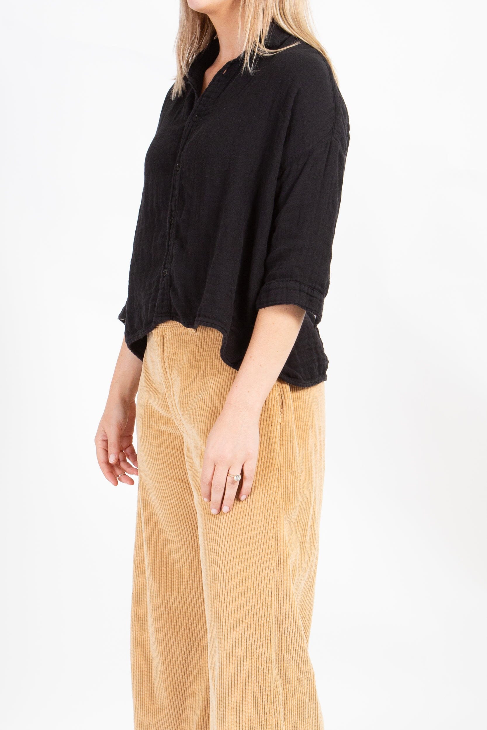 Boxy cropped shirt with a long sleeve and dropped shoulder.