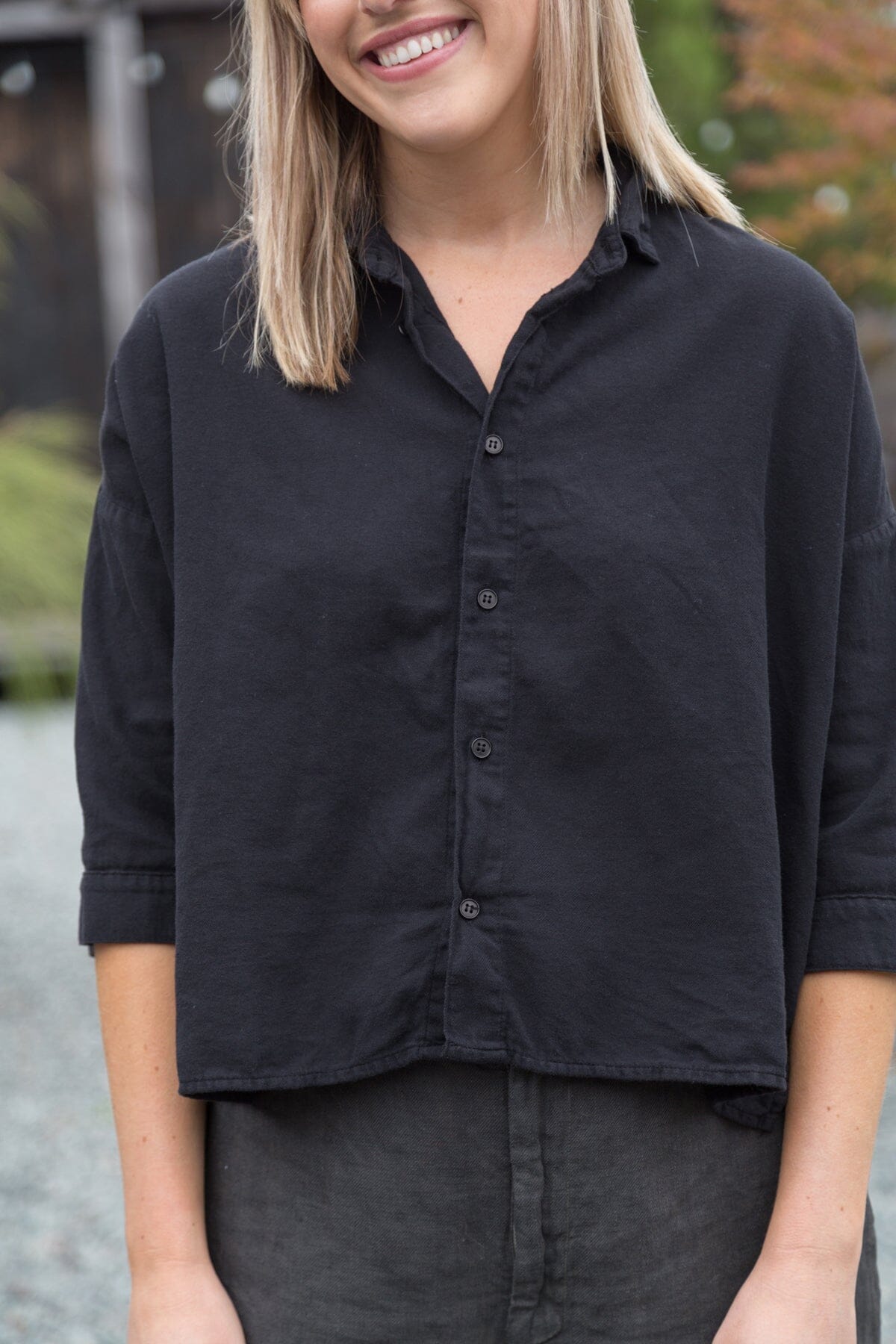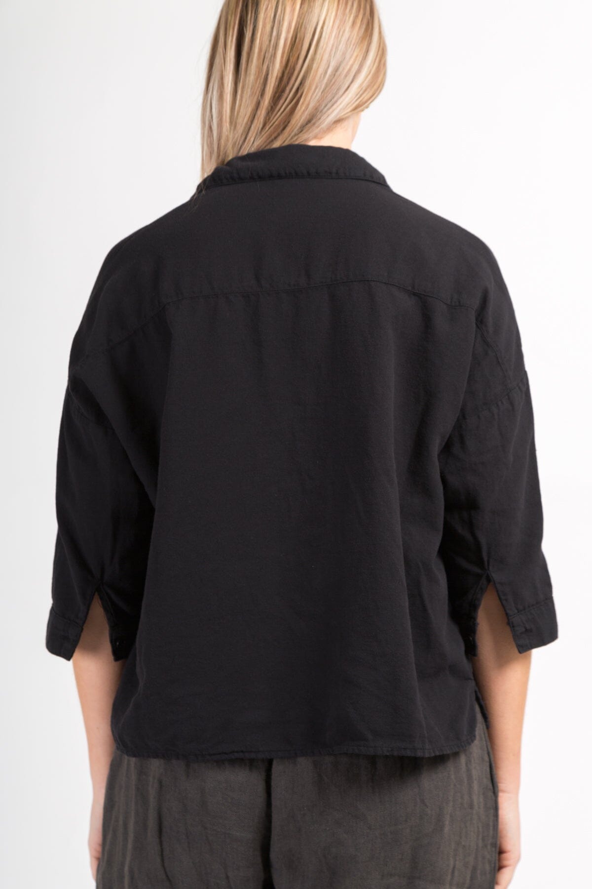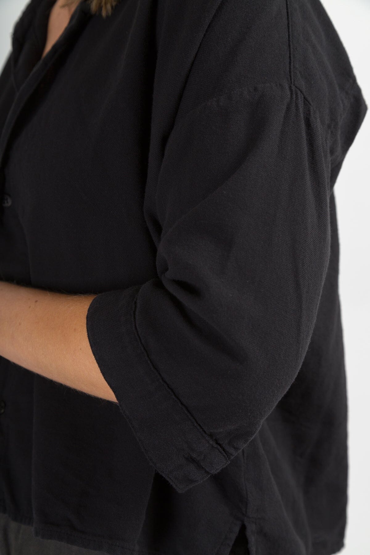 Boxy cropped shirt with a long sleeve and dropped shoulder.