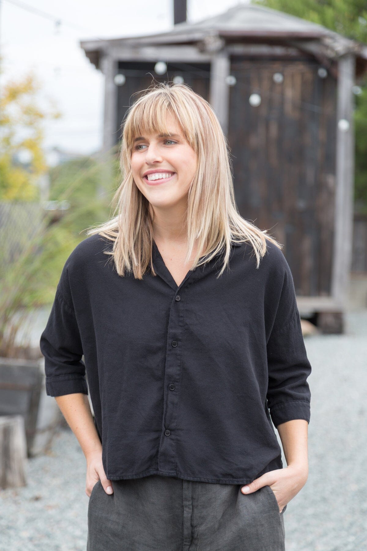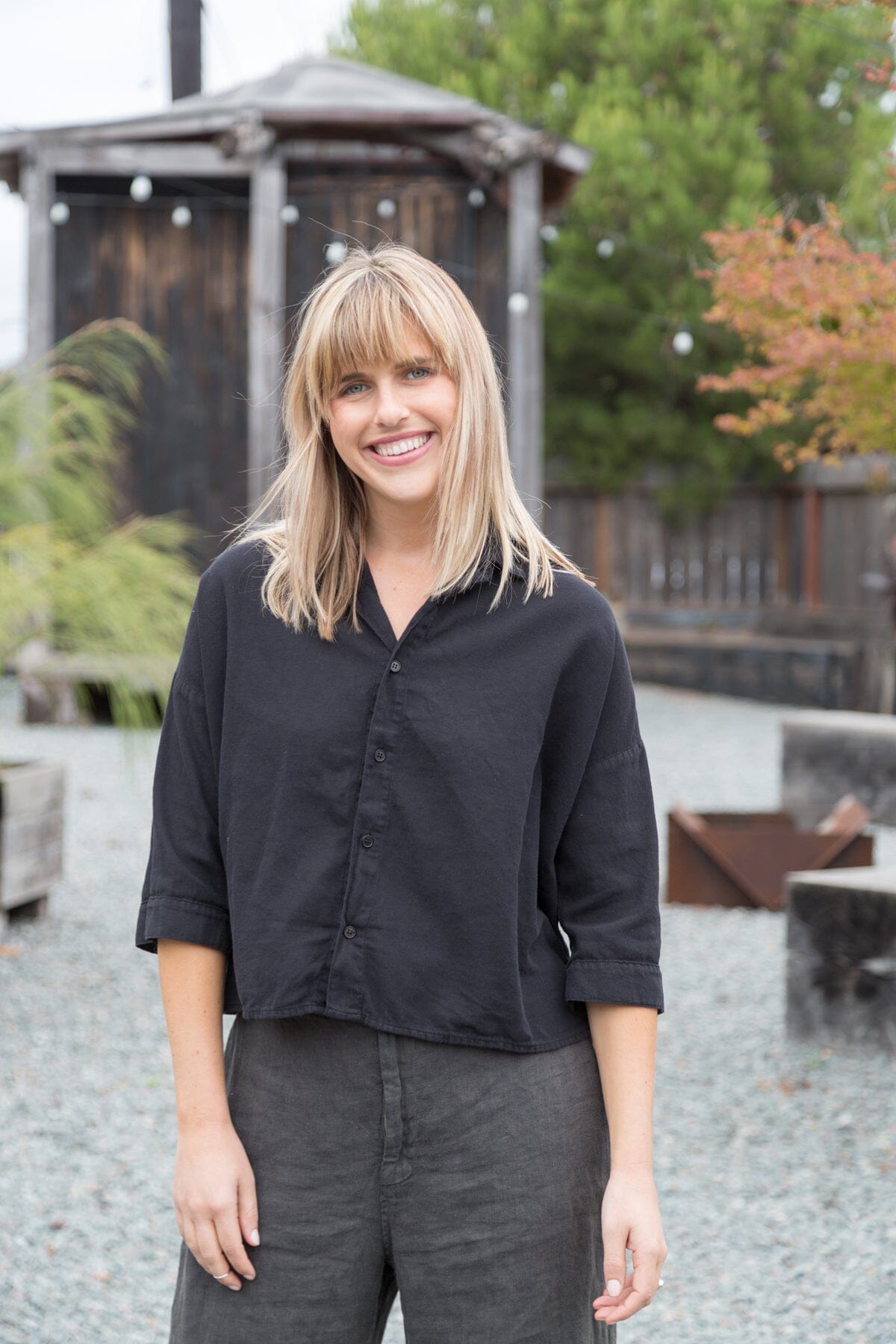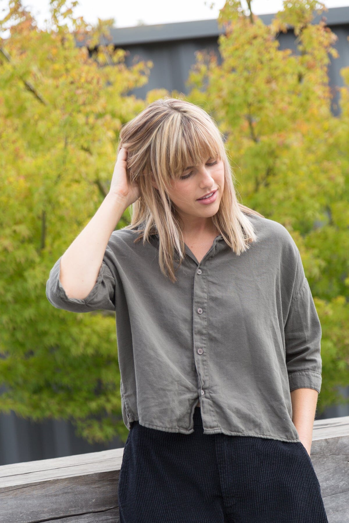 Boxy cropped shirt with a long sleeve and dropped shoulder.