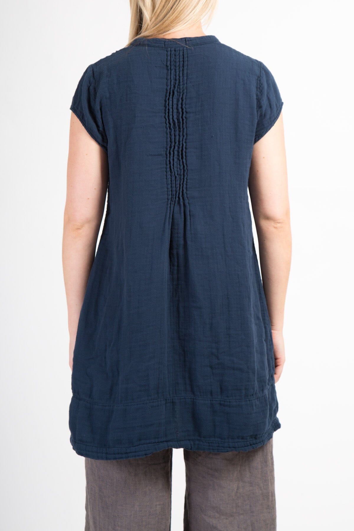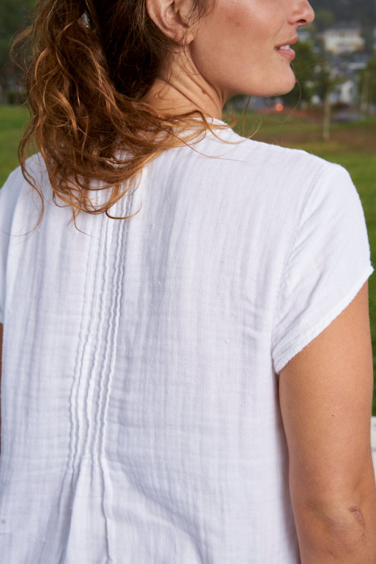 A tunic with a fitted pin tucked bodice, built-in v-neckline, and cap sleeves.