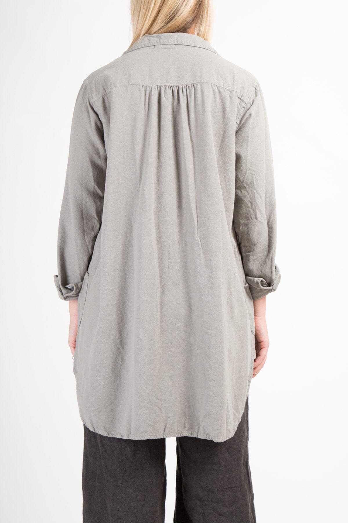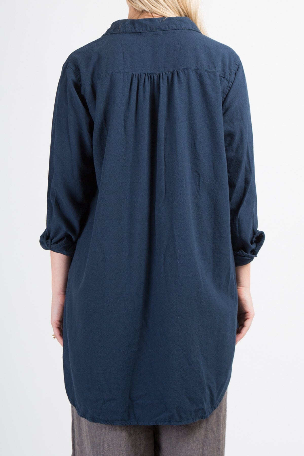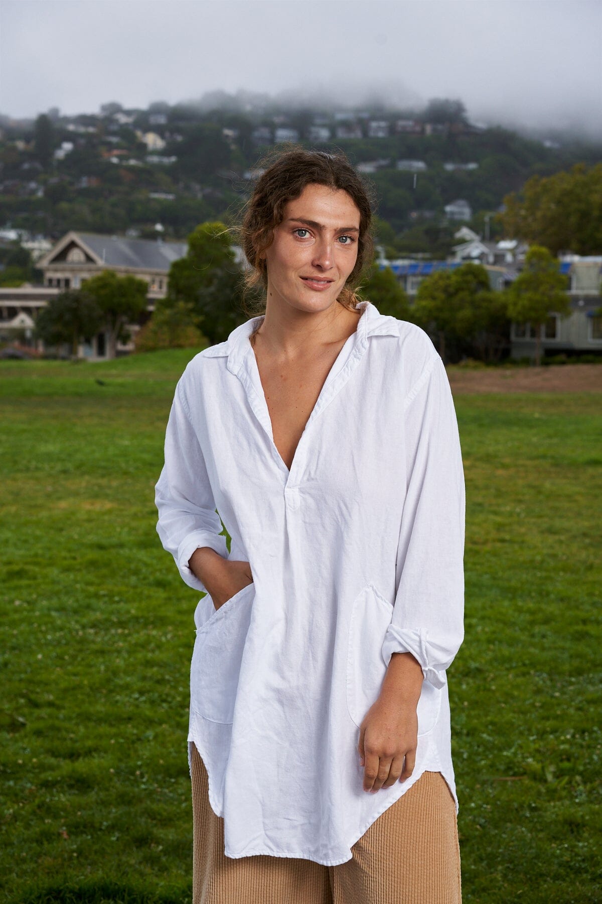 Relaxed-fitting pullover tunic with a deep V-neckline and patch pockets. Curved shirttail hem.
